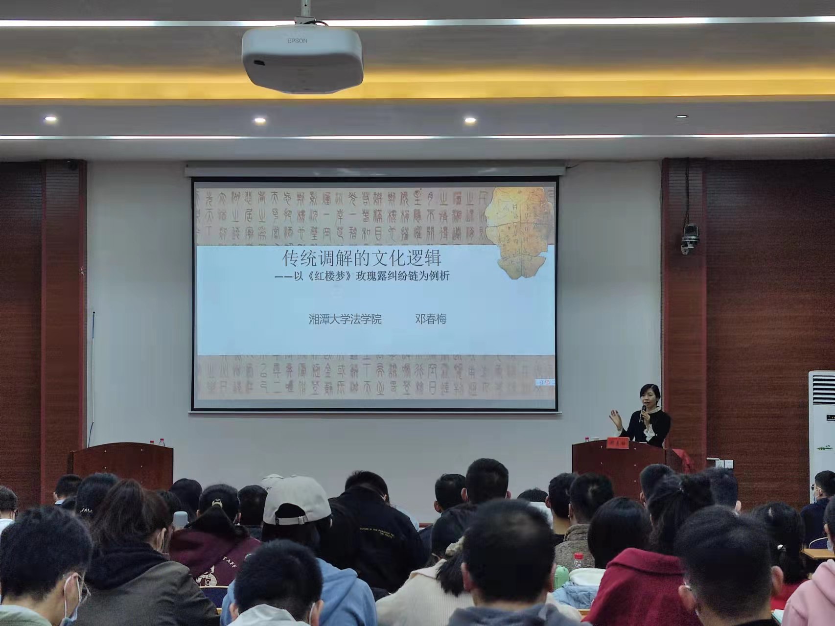 本网讯(通讯员 赵媛渊)为推动本次研究生学术活动节顺利开展,促进我校研究生自主开展以“乡村治理与法治社会建设”为主题的学术交流活动,营造敢于探索、勇于创新的学术氛围,达到开阔视野、启迪智慧、提高创新能力的目的,11月14日,我院特别请到湘潭大学法学院教授、博士生导师,台湾东吴大学法学院访问学者,美国俄亥俄州立大学莫里茨法学院访问学者,湖南省法学研究基地常务副主任邓春梅教授到我院开展讲座。本次讲座在商学院学术报告厅举行,由法学与公共管理学院郑牧民副院长主持会议,学院全体研究生参加讲座并学习。