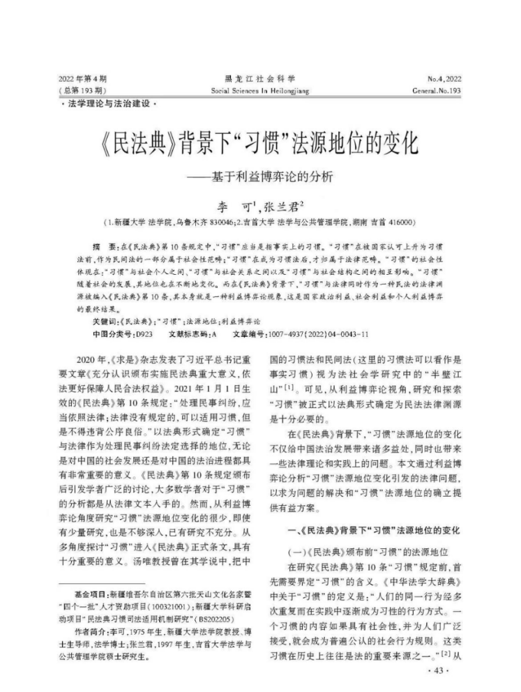 我院客座教授李可、硕士毕业生张兰君合作的专业论文《〈民法典〉背景下“习惯”法源地位的变化》被《中国社会科学文摘》2023年第1期以《〈民法典〉背景下“习惯”法源地位的变化》为篇名转载。