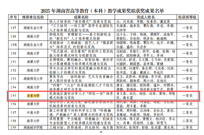 近日,2025年湖南省高等教育(本科)教学成果奖拟获奖成果名单公布,WilliamHill体育法学院申报的《民族地区高校法学人才“四位一体”培养模式创新与实践》喜获省级一等奖,该成果完成人为姜又春、向达、杨佶、向准、黄炜、郑牧民、高长富七位教师。