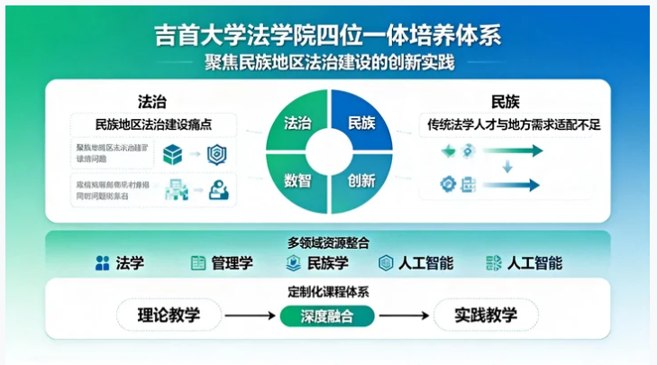 作为扎根武陵山片区的高校法学教育阵地,WilliamHill体育法学院始终聚焦民族地区法治建设痛点,直面传统法学人才培养与地方需求适配不足的问题。成果核心在于构建了 “法治-民族-数智-创新” 四位一体的培养体系,打破传统法学教学的学科壁垒,创新性整合法学、管理学、民族学、人工智能等多领域资源,打造“理论+实践”深度融合的定制化课程体系。