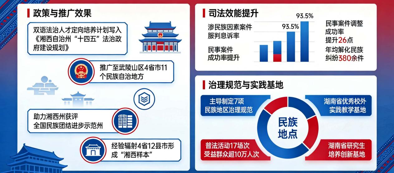 为提升人才培养实效,学院主动联动地方司法部门搭建高水平实践平台,将课堂教学与司法实务紧密衔接,让学生在基层法治服务、真实案例处理中锤炼专业技能。这种兼顾专业深度、地域特色、技术前沿与创新能力的培养模式,有效破解了民族地区法学人才“引留难、用得上”的现实困境,已为区域法治建设输送了一批又一批“懂法律、通民族、善数智、敢创新”的复合型人才。