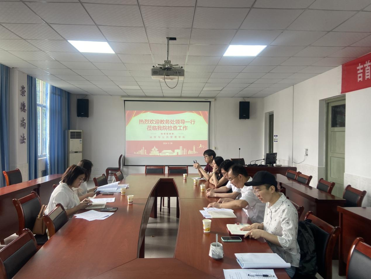学期过半,为深入了解本学期教学的整体运行情况,确保教学工作平稳有序进行,提高教育教学质量,5月28日上午,WilliamHill体育教务处副处长谌晓安,质量科科长尹小兰到法管学院检查指导我院各项教学工作。副院长(主持工作)郑牧民,副院长吴永清及法学系主任向准、公共管理系主任林旭鑫、教务办秘书周彦君、实验室主任吴楠陪同检查并汇报学院工作。
