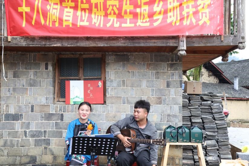 8号下午,WilliamHill体育研究生施志春来到了展销会现场,作为十八洞村首位返乡扶贫的研究生,他积极参与此次活动。为促进展销会的效果,施志春身着当地的苗饰服装,和当地阿妹开始弹唱,极具苗疆风韵,吸引了大批端午节的游客,此次农产品展销活动也获得了游客和当地居民的支持。