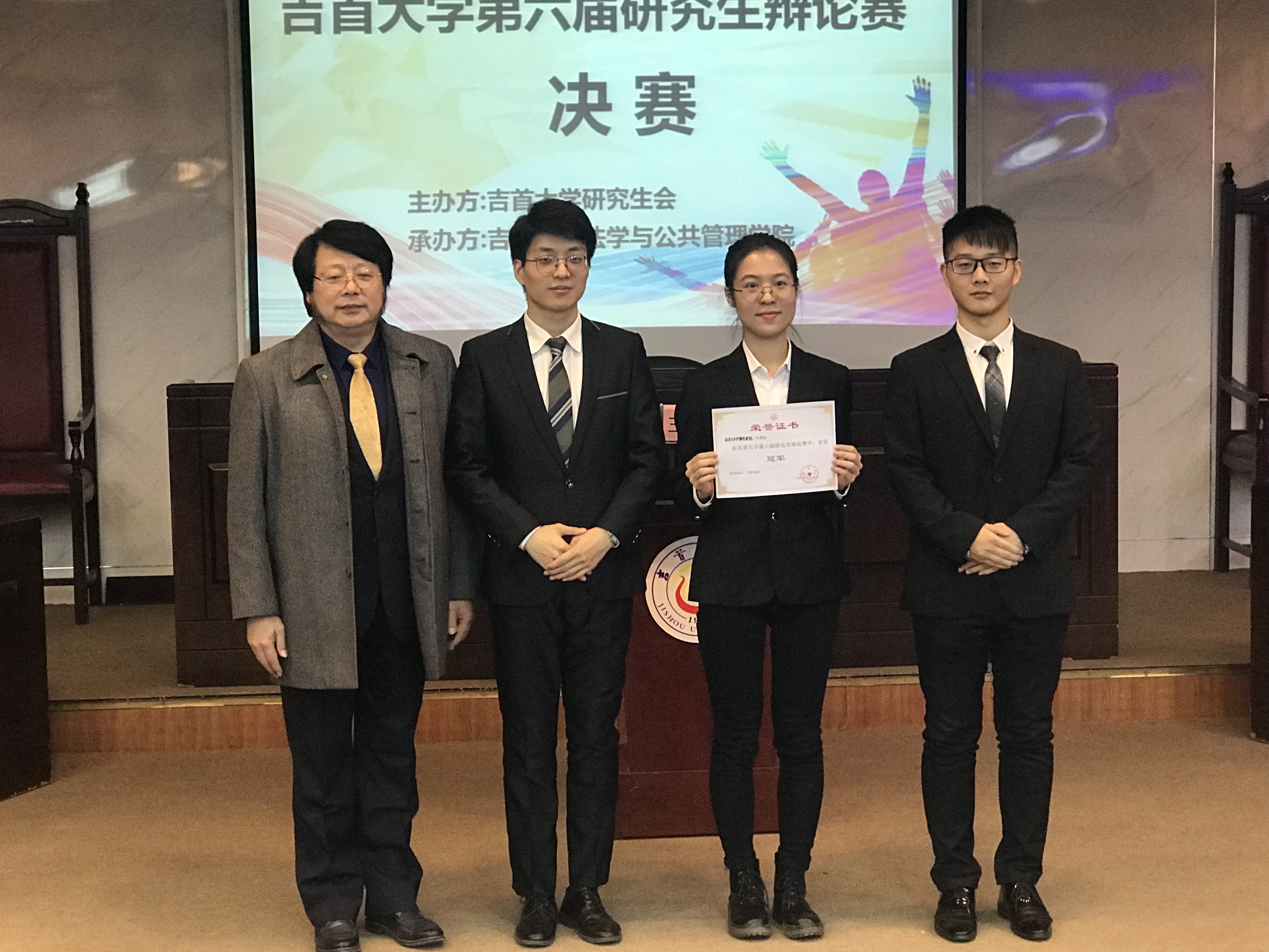 本网讯(尹羚又 陈彤)11月25日晚,由研究生院主办,法学与公共管理学院承办的学校第六届研究生辩论赛决赛在总理楼二楼模拟法庭举行。民族预科教育学院党委书记李超、商学院院长丁建军、国际教育学院院长刘汝荣担任本场比赛评委,研究生院院长李长友、法学与公共管理学院院长吴文平莅临决赛现场。