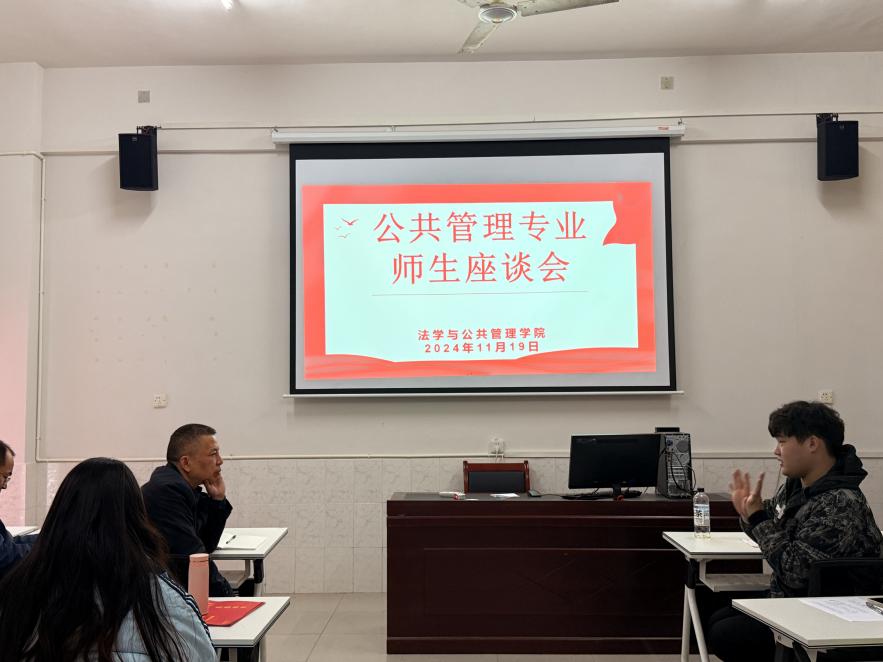 公共事业管理专业座谈会于三教六楼605-1召开,副院长吴永清、院团委书记哈米拉提・买合木提与 21-24级各班班委和学生代表参与,由副院长魏风劲主持。魏风劲副院长在会上总结过往座谈会经验,提炼出以学院为主导、以学生为主体的治理方式,鼓励学生发挥主人翁精神,积极为学院发展建言献策,共建美好未来。与会代表就学院信息采集、寝室公约条例拟写、宿舍安排等广泛议题展开交流。老师们在聆听完意见后,对大部分问题即刻提供解决方案,对重点难点问题则予以高度关注并持续跟进。