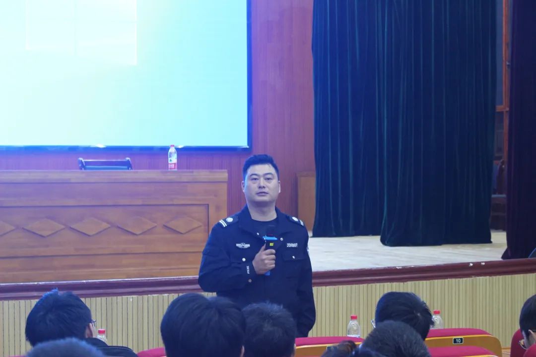 紧接着,由砂子坳派出所胡警官进行防诈演讲。演讲前胡警官为在座听众发放了防诈宣传单,并表示此宣传单上案例皆为本校案例,裸聊、刷单、网络游戏平台交易等等真实案例皆触目惊心。胡警官特别强调,被电信诈骗的钱财追回希望十分渺茫,呼吁同学们对待电信诈骗一定要十分重视且谨慎。