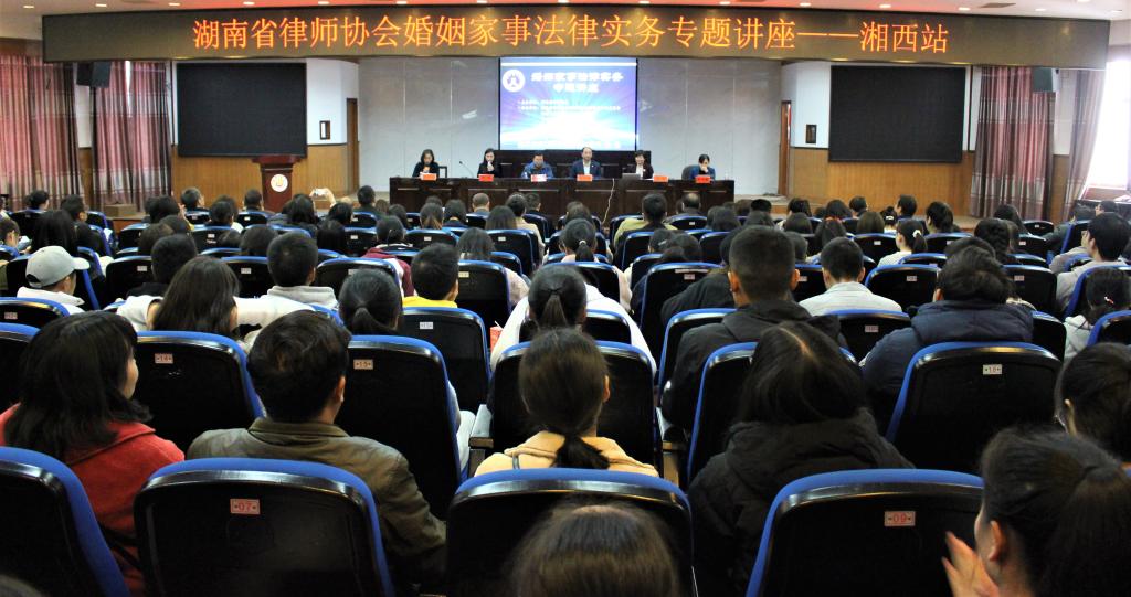 湖南省律师协会婚姻家庭法律事务专业委员会主任万薇、副主任余宇,湘西土家族苗族自治州律师协会会长杨志远、副会长苏红丽,湖南省律师协会婚家委部分委员,湖南省融邦律师事务所邹露璐等执业律师、实习人员,以及我院党委书记彭献忠等老师学生共同参加此次讲座。讲座由苏红丽主持。