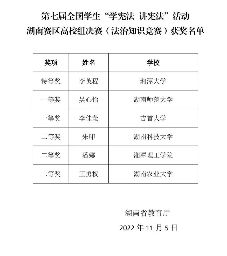 本网讯(通讯员 刘媛 欧阳静)11月5日, “学宪法,讲宪法”活动湖南赛区高校组决赛中的最后一场线上考试顺利结束。经过选手们的激烈比拼,我院法学专业李佳莹同学在众多选手角逐中脱颖而出,最终取得湖南赛区高校组一等奖的优异成绩。