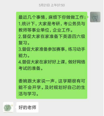 灾难无情人有情。作为一名教师,理应不忘教育初心,肩负教师职责,传道、受业、解惑。在特殊的疫情日子里,王作剩老师同全校、全院老师一样,积极响应“停课不停教、停课不停学”的号召,上好网课。而且也非常关心学生,将知识与爱,传递给学生,用知识与爱,共同抗疫。
