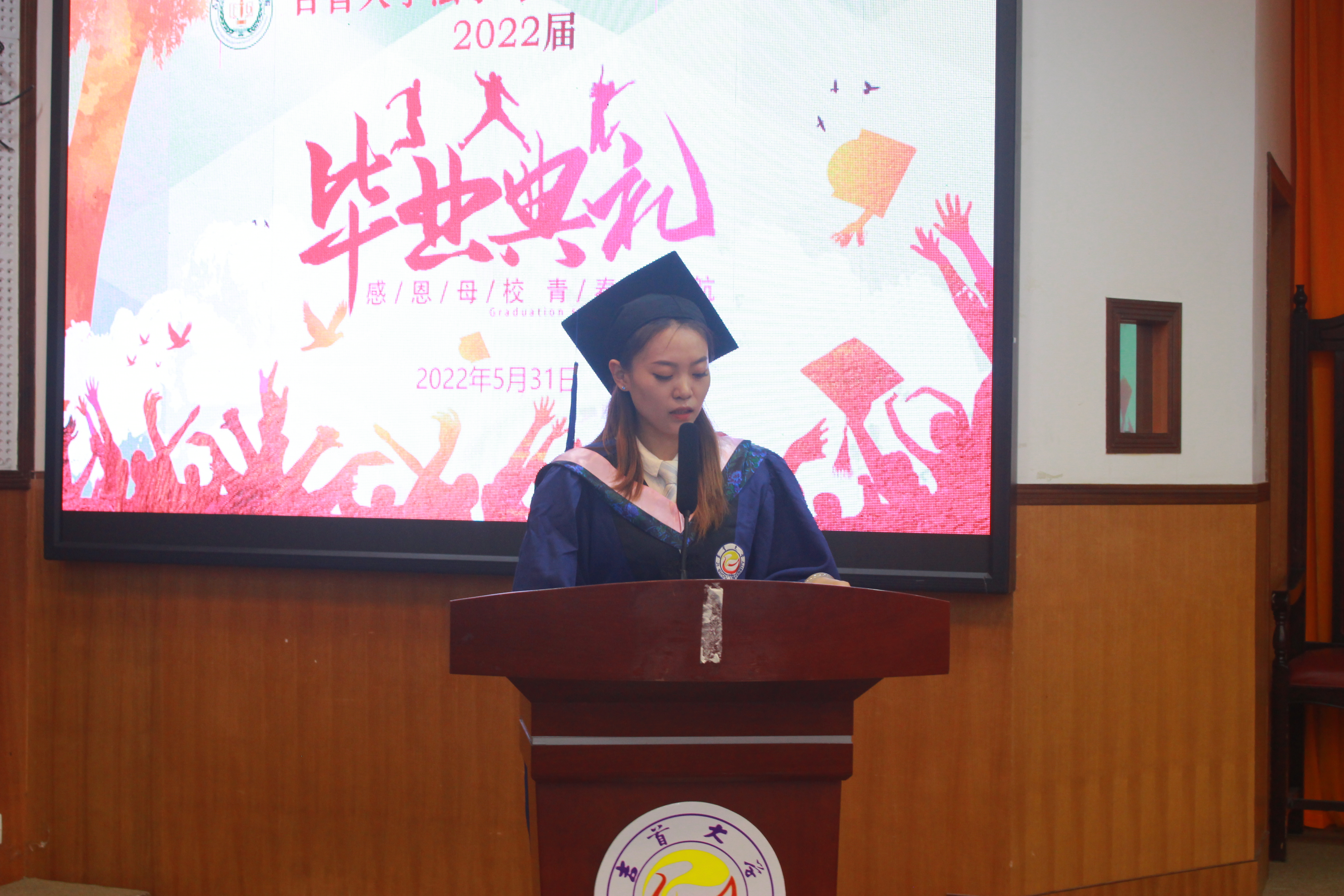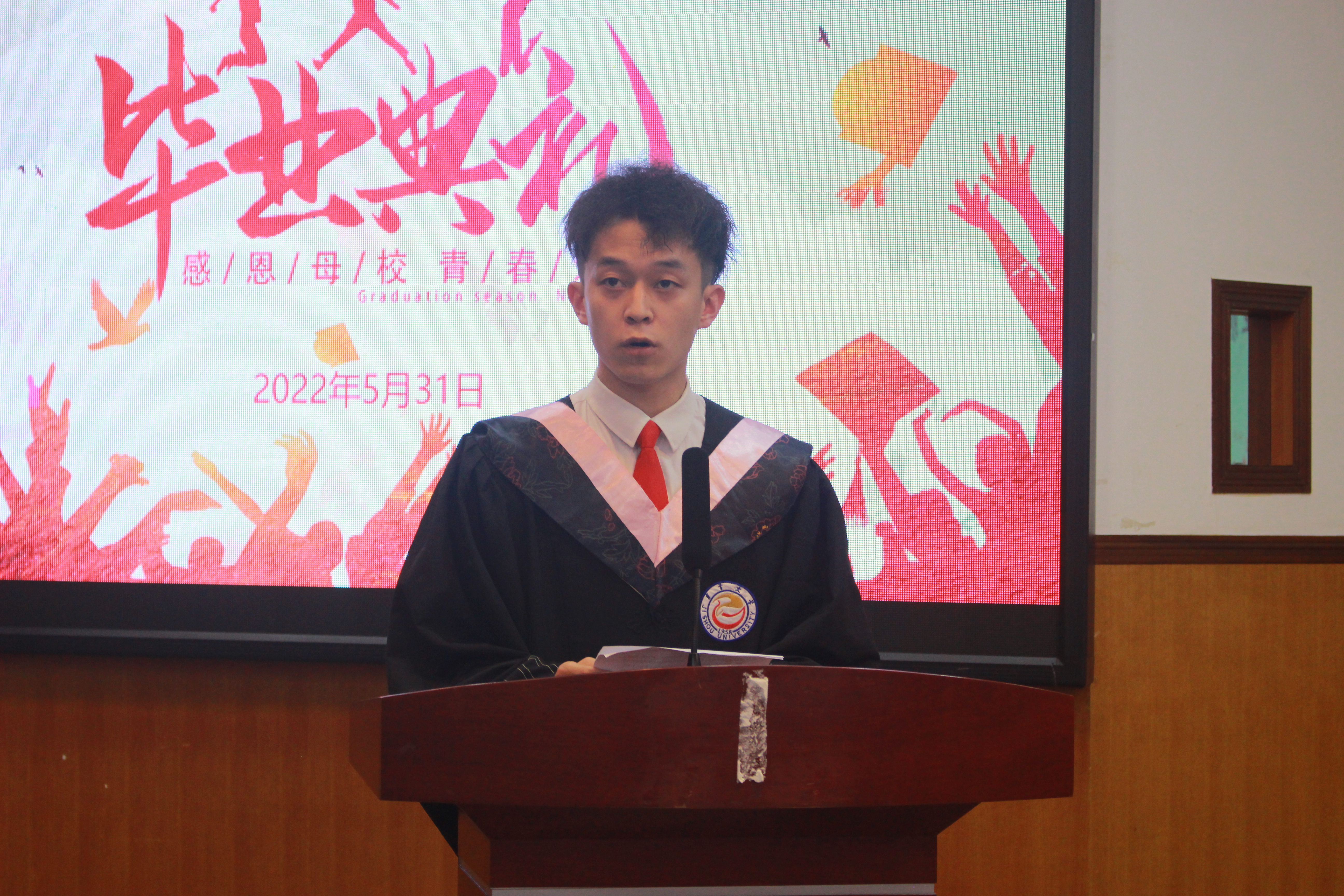 本科生代表王朗作临别赠言,他讲述了自己在吉大四年学习和生活上的收获,也深刻表示了对母校和老师的真诚感恩,愿吉大学子都能以青春之名,赴时代之约,将自己的精力投入到伟大的为祖国奋斗中去,以人名校,以业报国,在自己的岗位努力奋斗!研究生代表杨宇凌向谆谆教导的老师们表达了诚挚的感谢,为团结友爱的同学们献上衷心的祝福,并表示誓以“以人名校,以业报国”的校训督促自己,做到不负祖国、不负人民。她用一首《再见》来表达她的心情 将所有的不舍与感恩都融入歌声里,诉说别离,难忘吉大。
