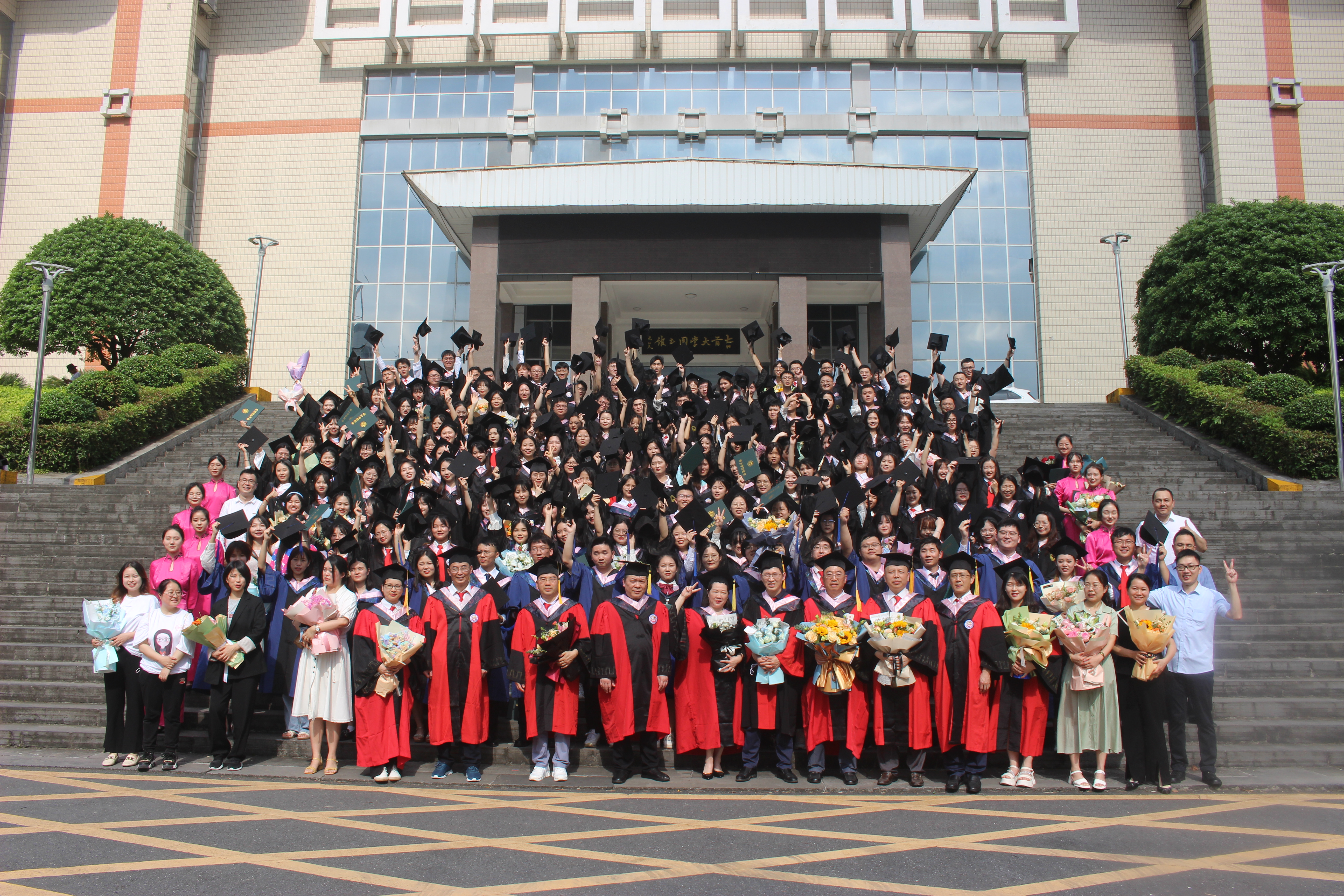 最后全体起立,奏唱校歌。老师与同学们有序前往我校图书馆前合影留念,为自己的大学生活篇章画上圆满的句号。