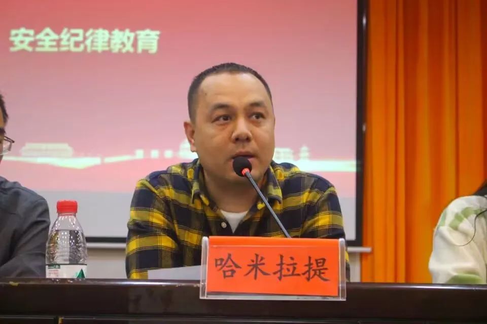 哈米拉提•买合木提作安全纪律教育,他强调:疫情期间,毕业生要注意离校、返校手续的办理,做好个人防护;注意宿舍免检问题;维持宿舍的纪律;就业期间要保证住宿安全、交通安全、人身安全、财产安全。