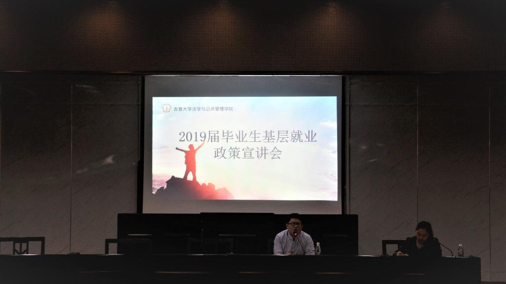本网讯(罗慰 熊澜)为进一步做好我院2019届毕业生就业工作,鼓励和引导毕业生在基层就业、成长、成才,我院于5月7日上午在模拟法庭举办了2019届毕业生基层就业政策宣讲会。学工办主任段武城、副主任文兰、办公室副主任闫慧远及我院2019届全体毕业生参加宣讲会。宣讲会由文兰主讲。
