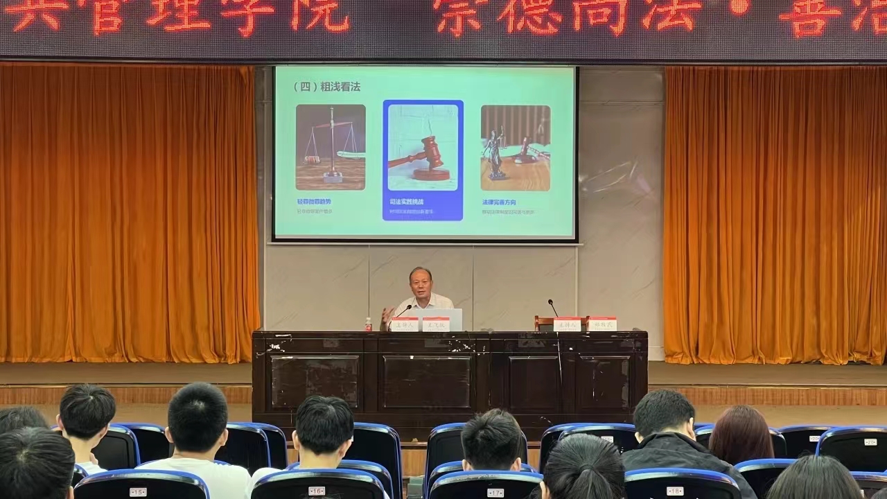 5月17日,在我院砂子坳校区模拟法庭,一场以“崇德尚法·善治为公”为主题的学术讲堂如期举行。本次讲座有幸邀请到中南林业科技大学法学院教授兼院长王飞跃主讲,他围绕“当前刑事法学几个热点问题的冷思考”这一主题,为我院2021级法学专业的学生带来了一场思想盛宴。讲座由我院主持工作副院长郑牧民主持。