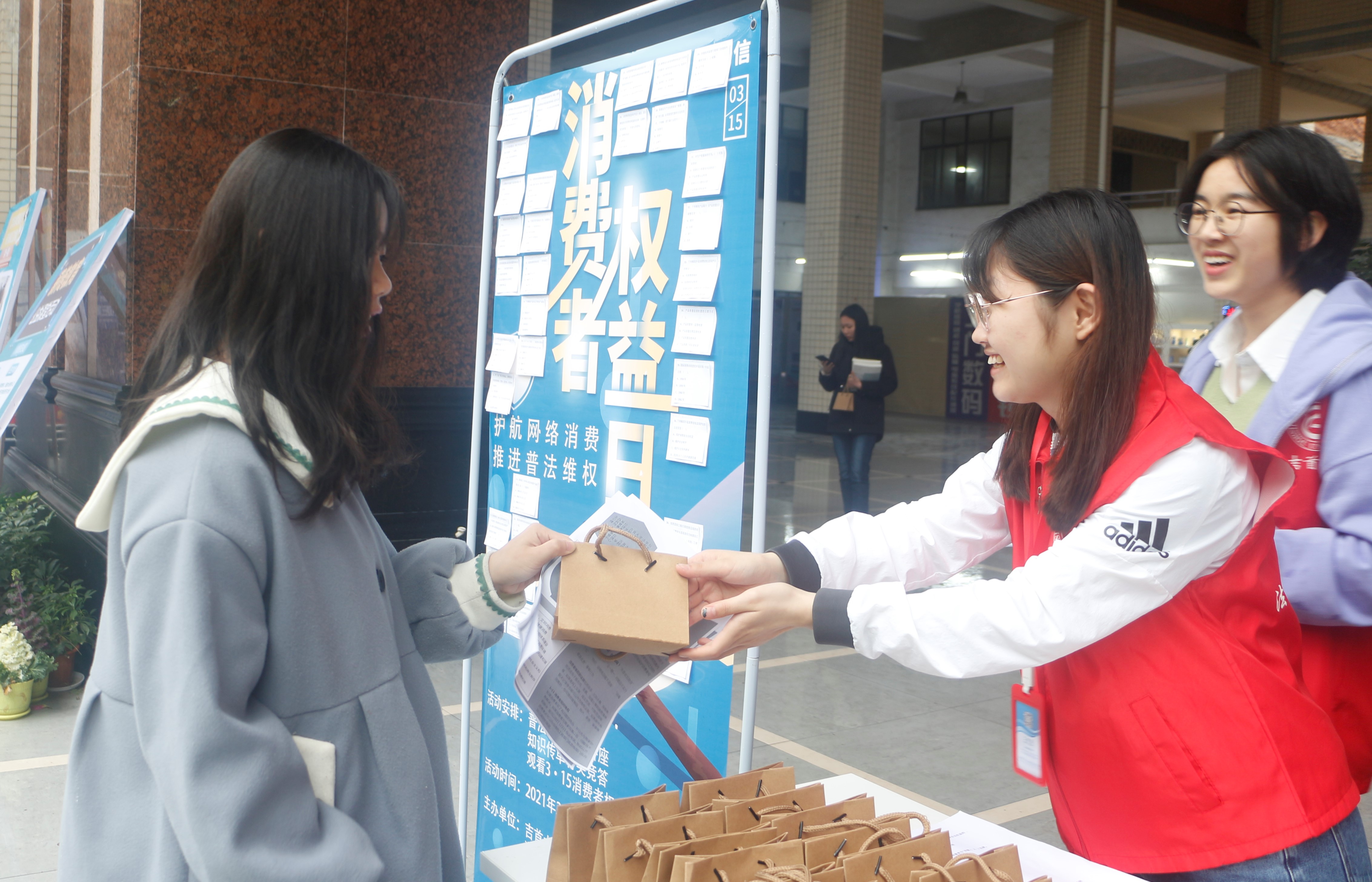 志愿者们身着红色志愿服,热情地向我院学生分发知识传单,细心向同学们说明活动规则,并积极引导同学们参与活动。同学们仔细阅读知识传单上的内容,了解关于消费者权益的知识,并积极回答卡片上的竞答问题。竞答完毕后,志愿者们向参与者分发小礼品,活动现场气氛十分火热。
