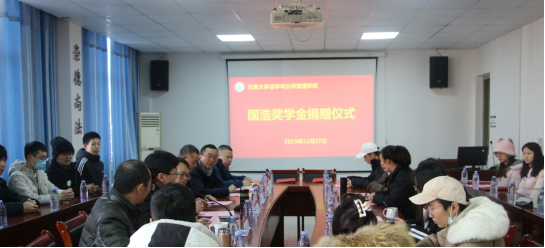 本网讯(通讯员 陈一航) 12月27日上午,WilliamHill体育法学与公共管理学院举行“国浩奖学基金”捐赠仪式。国浩律师事务所(长沙)高级合伙人李龙,WilliamHill体育教育发展基金会理事长李荣光,法学与公共管理学院党委书记彭献忠、主持工作副院长郑牧民、副院长魏风劲、吴永清,学工办主任文兰,法学系主任向准及部分师生出席仪式,仪式由郑牧民主持。