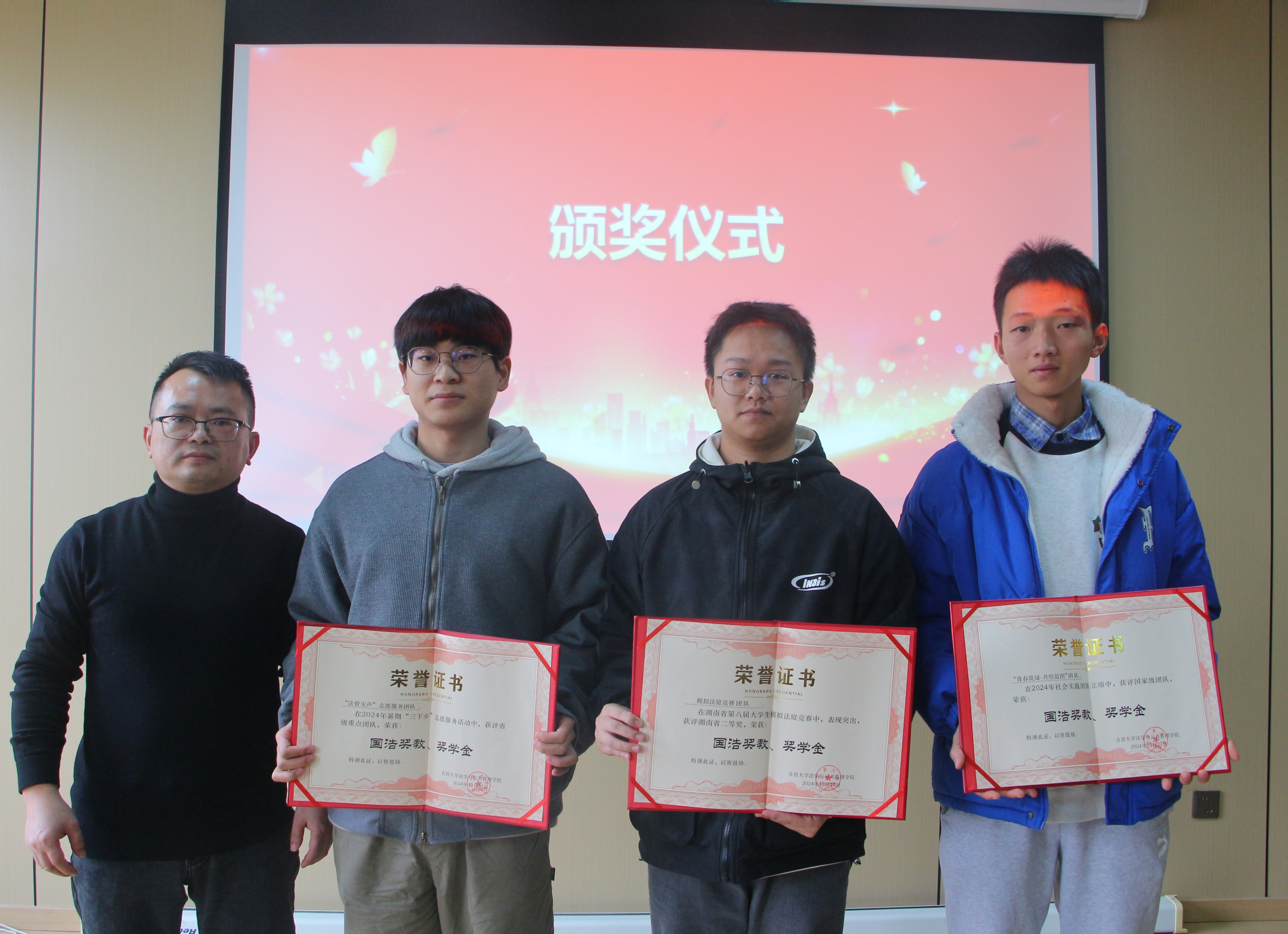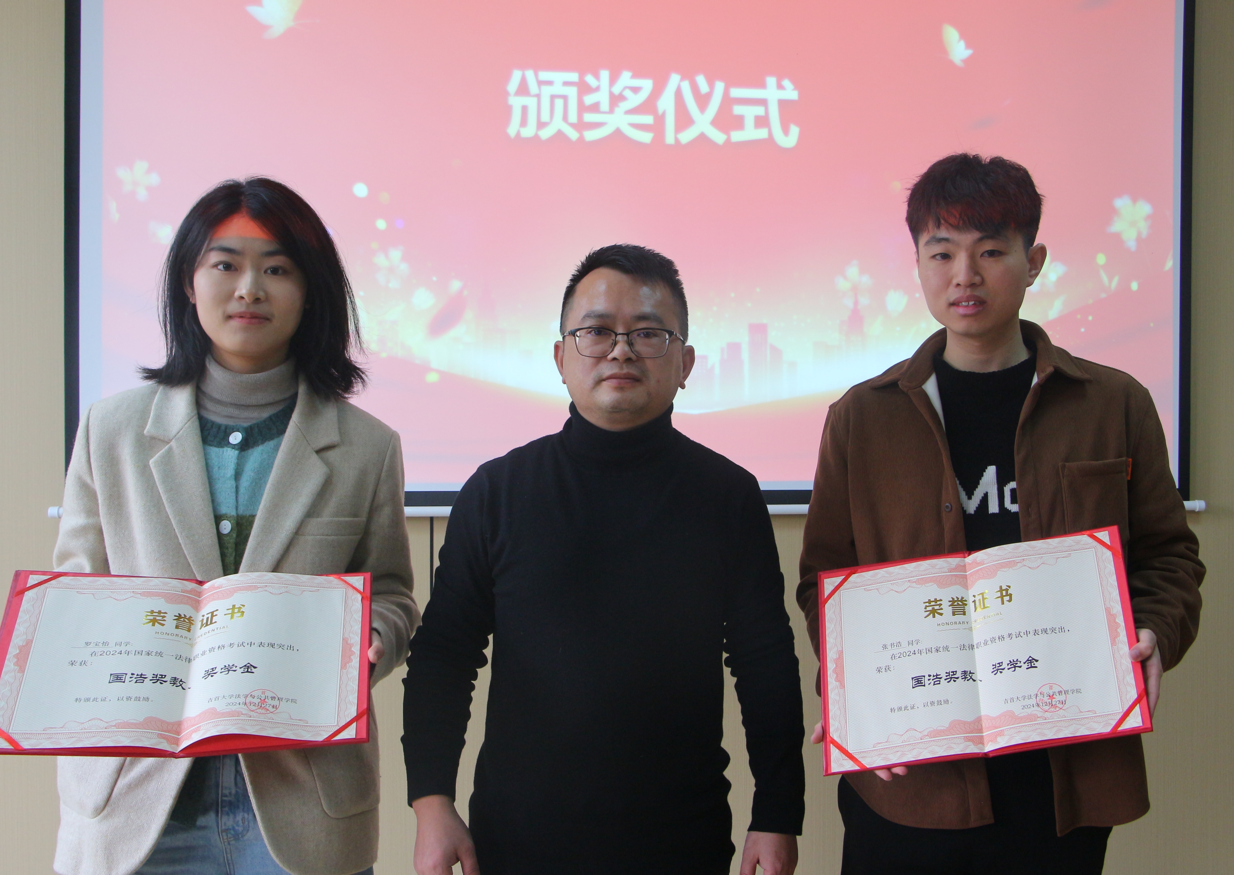 郑牧民宣读了《关于表彰首届WilliamHill体育“国浩奖教、奖学金”获奖师生的决定》,希望获奖人员坚守初心,再接再厉,取得更多更好的成绩。希望广大同学要以受表彰的先进典型为榜样,用我所学,尽我所能,为法治湘西,法治湖南建设贡献源源不绝的青春力量。