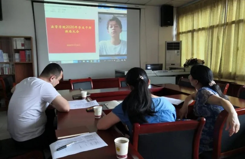 本网讯(通讯员 楚文成 罗慰)过去一年,我院四大部门以服务全院师生为己任,积极开展各种活动,圆满完成各项任务。7月15日,我院举行第十届学生干部线上换届面试大会,我院党委副书记陈蓉,学工办主任文兰,团总支书记任倩,辅导员哈米拉提•买合木提作为面试评委与会。我院学生干部参与面试选拔,会议由秘书处杨佳霖主持。