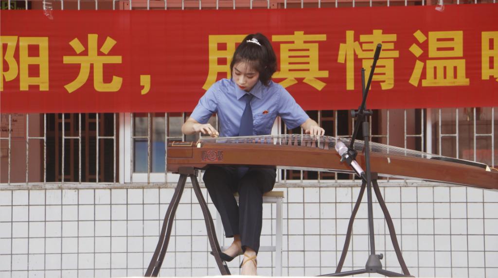 户外的“才艺表演与互动”环节中,服刑人员带来了充满气势的苗鼓表演和极具土家族特色的摆手舞,检察院代表为我们带来了优美的古筝独奏《浏阳河》。此外,同学们也带来了民族舞蹈表演、吉他弹唱和二胡独奏等表演,歌曲《我相信》更是带动了全场氛围。最后,才艺表演随着服刑人员传递温暖的手语操《感恩的心》结束。随后,检察院干警、学院学生与服刑人员分别派出代表进行了友谊篮球赛,球场上各队伍精彩的表现令人连连称赞。随后,所有参与人员在“心怀阳光,情暖高墙”主题横幅上签字并合影留念。最后,部分同学参观了州人民检察院驻吉首监狱检察室,了解了驻监检察室的功能和基本任务。